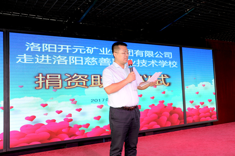 上午10點20分儀式開始,集團總經(jīng)理助理叢萬通代表公司發(fā)表講話,他重點談到:近年來,開元礦業(yè)集團在董事長許明月的帶領(lǐng)下,強力推進企業(yè)發(fā)展的同時,積極開展各項社會公益活動,在慈善愛心公益領(lǐng)域不遺余力,先后為汝陽縣馬溝小學(xué),洛寧縣東宋鎮(zhèn)郭村小學(xué)、兒童福利院、興華鎮(zhèn)中心小學(xué),宜陽縣紅斑狼瘡重病小女孩、文物保護維護等捐款捐物累計超過100萬元。作為洛陽慈善總會理事單位,得知洛陽慈善職業(yè)技術(shù)學(xué)校部分學(xué)生還沒有統(tǒng)一的職業(yè)西服后,集團立即聯(lián)系校方,為學(xué)校捐贈60套校服西裝,價值9000余元;希望同學(xué)們將社會各界的關(guān)愛轉(zhuǎn)化為學(xué)習(xí)的動力,積極回報社會。